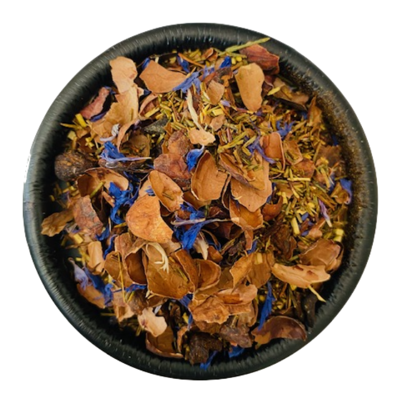 Green Rooibos tea, Cocoa bean peels, Cocoa bean bits (10%), Chicory roots, Natural flavouring, Cornflower blossoms.